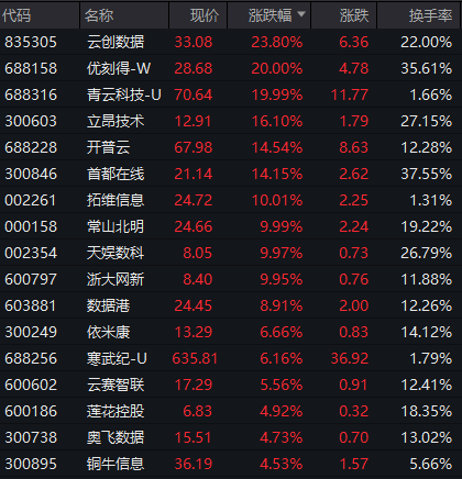 AI算力概念股表现活跃,拓维信息、梦网科技、科华数据等多股涨停。