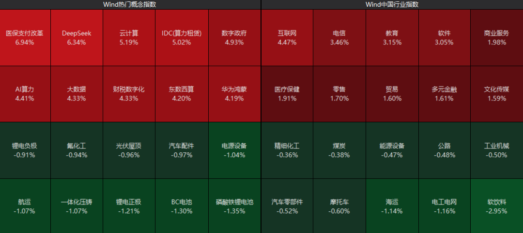 板块上来看,DeepSeek概念再度引爆市场,AI算力、AI医疗、云计算、互联网、电信等板块均走强,旅游、零售、文化传媒等板块表现活跃;而锂电、航运、电工电网等板块震荡调整。