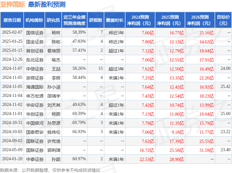海通国际证券集团有限公司孙小涵近期对亚钾国际进行研究并发布了研究报告《公司拟收购农钾资源28.14%少数股权,提升权益产能》,给予亚钾国际增持评级,目标价25.42元。