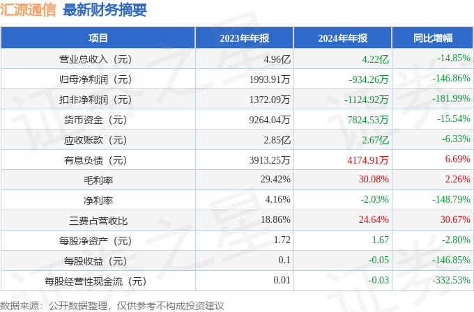 据证券之星公开数据整理,近期汇源通信(000586)发布2024年年报。截至本报告期末,公司营业总收入4.22亿元,同比下降14.85%,归母净利润-934.26万元,同比下降146.86%。按单季度数据看,第四季度营业总收入1.45亿元,同比下降2.44%,第四季度归母净利润-673.1万元,同比下降1301.8%。本报告期汇源通信三费占比上升明显,财务费用、销售费用和管理费用总和占总营收同比增幅达30.67%。