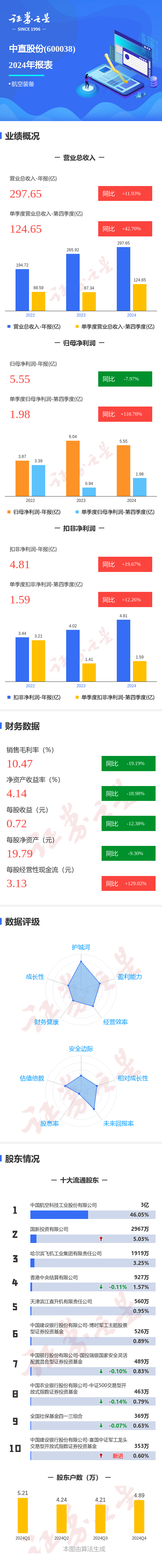 证券之星消息,中直股份2024年年报显示,公司主营收入297.66亿元,同比上升11.93%;归母净利润5.56亿元,同比下降7.98%;扣非净利润4.82亿元,同比上升19.68%;其中2024年第四季度,公司单季度主营收入124.65亿元,同比上升42.71%;单季度归母净利润1.99亿元,同比上升110.71%;单季度扣非净利润1.59亿元,同比上升12.26%;负债率68.62%,投资收益4718.62万元,财务费用7083.95万元,毛利率10.47%。