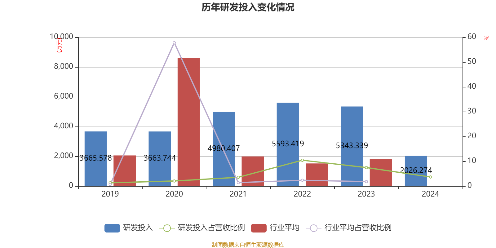 2024年全年,公司研发投入金额为2026.27万元,同比下降62.08%;研发投入占营业收入比例为3.64%,相比上年同期下降3.79个百分点。此外,公司全年研发投入资本化率为0%。