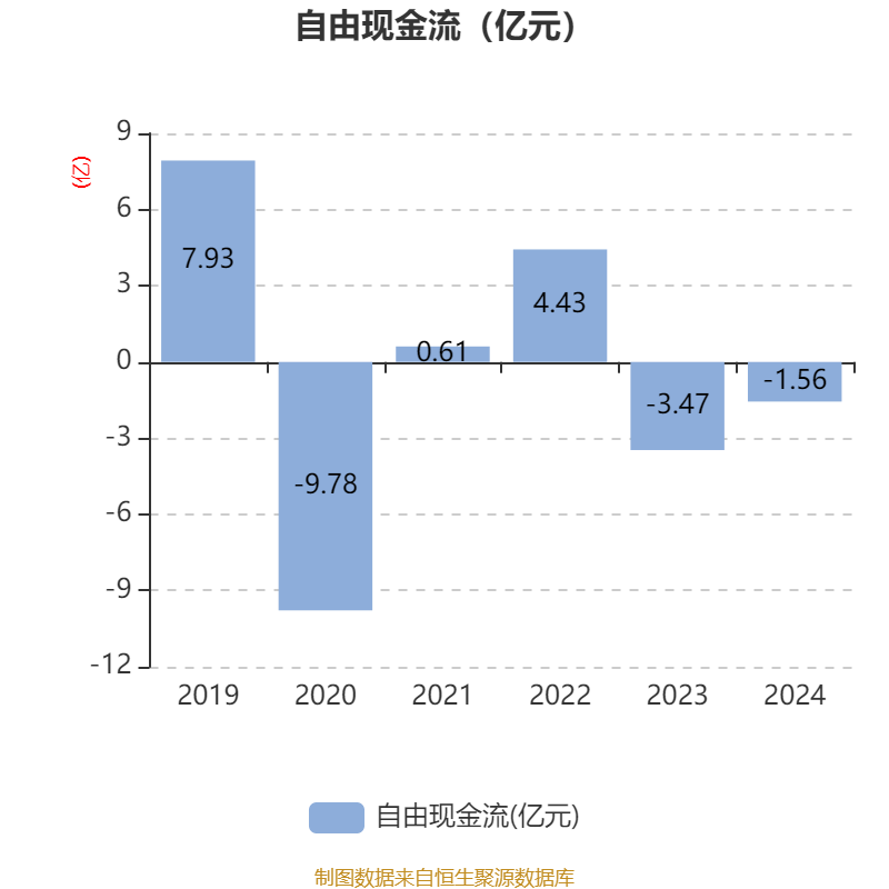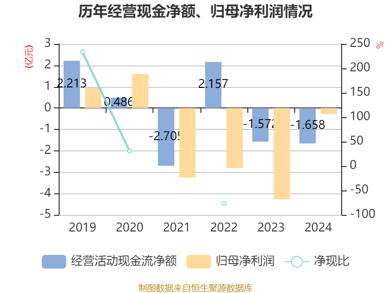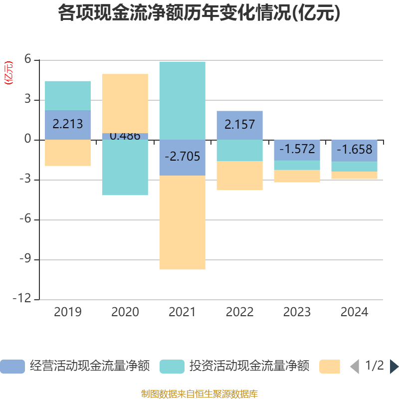 截至2024年,公司经营活动现金流净额为-1.66亿元,同比减少863.78万元;筹资活动现金流净额-5494.23万元,同比增加3729.36万元;投资活动现金流净额-7407.16万元,上年同期为-7103.32万元。