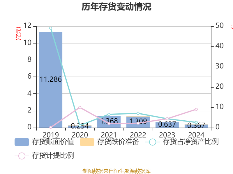 从存货变动来看,截至2024年末,公司存货账面价值为3672.05万元,占净资产的2.58%,较上年末减少2696.39万元。其中,存货跌价准备为363.54万元,计提比例为9.01%。