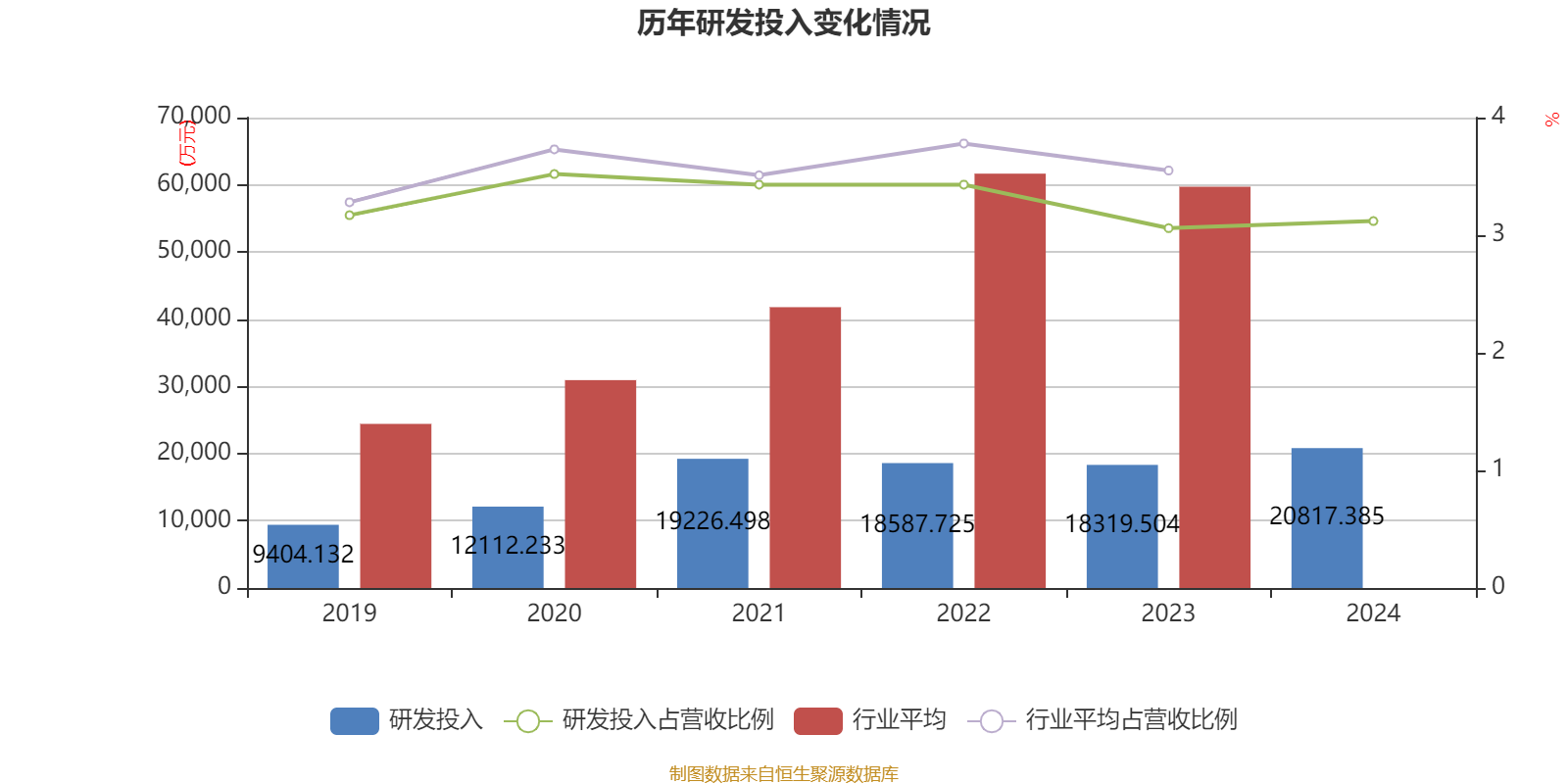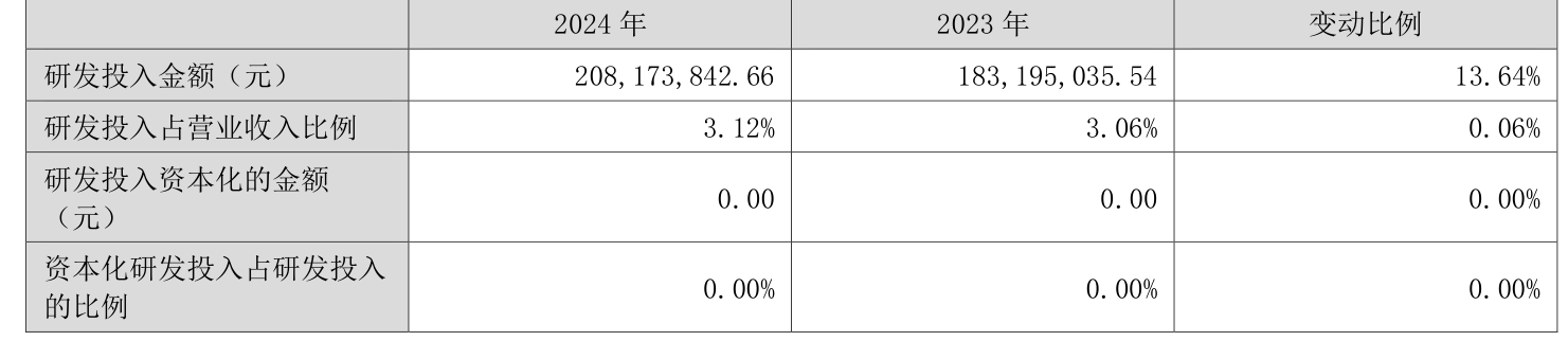 2024年全年,公司研发投入金额为2.08亿元,同比增长13.64%;研发投入占营业收入比例为3.12%,相比上年同期上升0.06个百分点。此外,公司全年研发投入资本化率为0%。