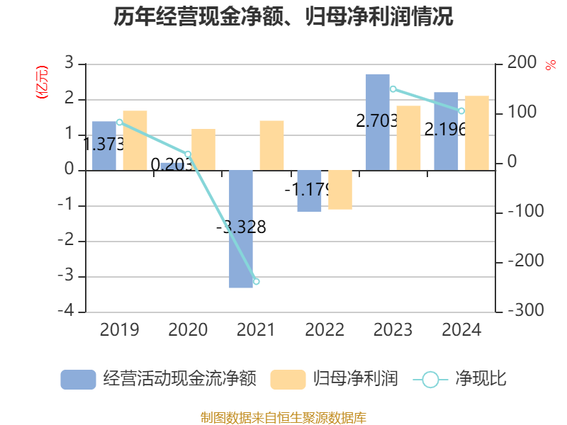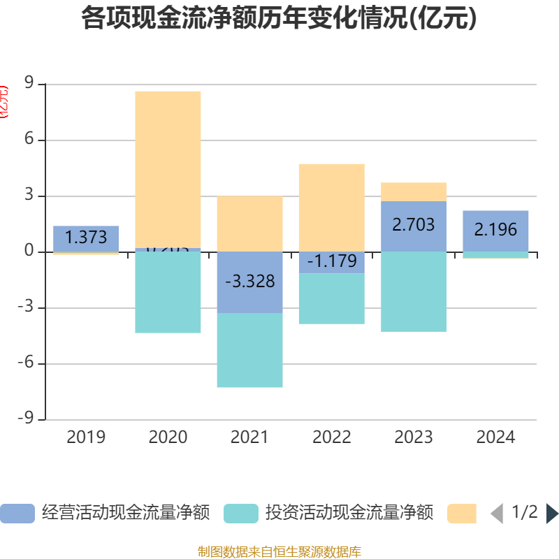 截至2024年,公司经营活动现金流净额为2.2亿元,同比下降18.75%;筹资活动现金流净额-209.32万元,同比减少1.02亿元;投资活动现金流净额-3641.13万元,上年同期为-4.31亿元。