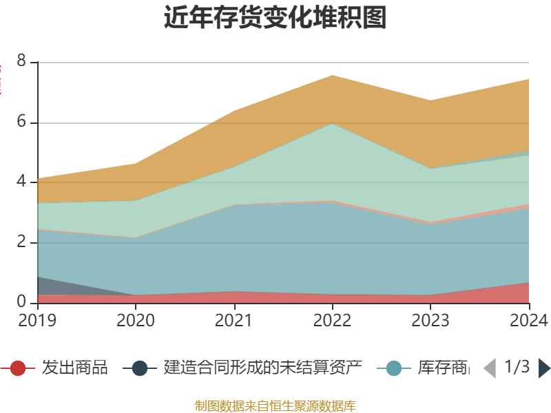 从存货变动来看,截至2024年末,公司存货账面价值为7.43亿元,占净资产的28.16%,较上年末增加7113.05万元。其中,存货跌价准备为1869万元,计提比例为2.45%。