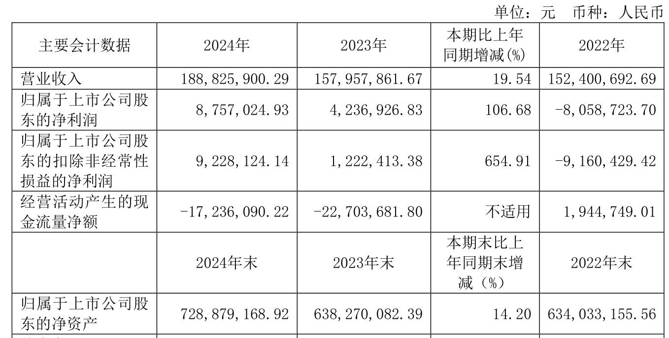 中证智能财讯丰华股份(600615)3月29日披露2024年年度报告。2024年,公司实现营业总收入1.89亿元,同比增长19.54%;归母净利润875.7万元,同比增长106.68%;扣非净利润922.81万元,同比增长654.91%;经营活动产生的现金流量净额为-1723.61万元,上年同期为-2270.37万元;报告期内,丰华股份基本每股收益为0.05元,加权平均净资产收益率为1.36%。公司2024年度分配预案为:拟向全体股东每10股转2股。