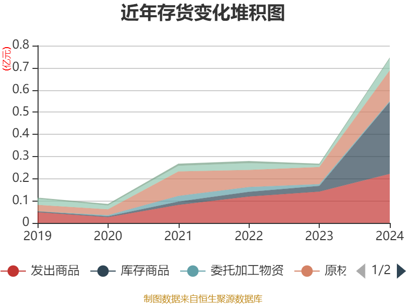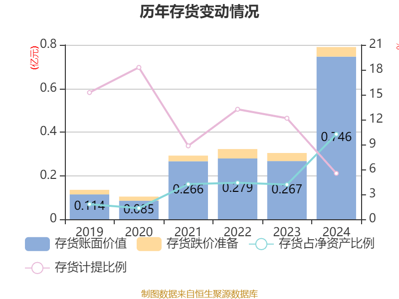 从存货变动来看,截至2024年末,公司存货账面价值为7462.71万元,占净资产的10.24%,较上年末增加4796.09万元。其中,存货跌价准备为436.78万元,计提比例为5.53%。
