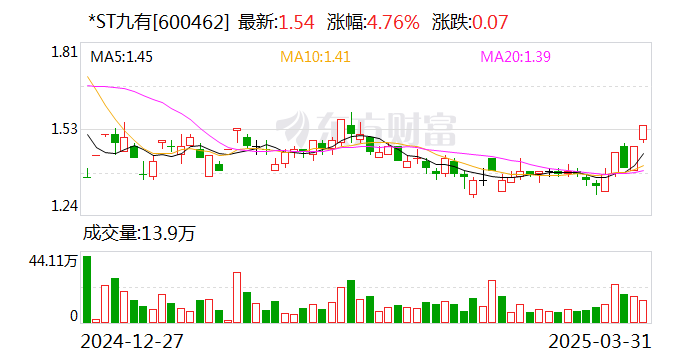 *ST九有(维权)再度涨停,4个交易日内录得3个涨停,累计涨幅为11.59%,累计换手率为11.91%。截至9:37,该股今日成交量1294.58万股,成交金额1980.43万元,换手率2.16%。最新A股总市值达9.50亿元,A股流通市值9.25亿元。