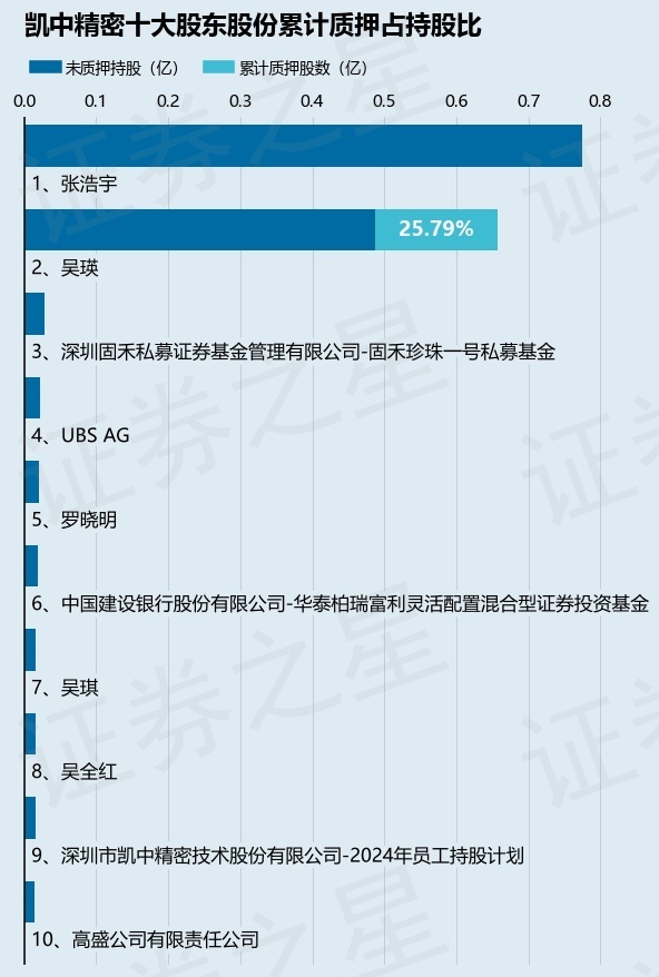 截止本公告日,股东吴瑛已累计质押股份1695.4万股,占其持股总数的25.79%。本次质押后凯中精密十大股东的累计质押股份占持股比例(占持股比例的计算以公司最新一期财务报表公布的十大股东的持股总数为基准)见下图: