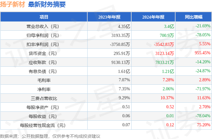 据证券之星公开数据整理,近期扬子新材(维权)(002652)发布2024年年报。截至本报告期末,公司营业总收入3.4亿元,同比下降21.69%,归母净利润700.9万元,同比下降78.05%。按单季度数据看,第四季度营业总收入7278.06万元,同比下降27.86%,第四季度归母净利润-509.53万元,同比下降110.44%。本报告期扬子新材公司应收账款体量较大,当期应收账款占最新年报归母净利润比达1117.59%。