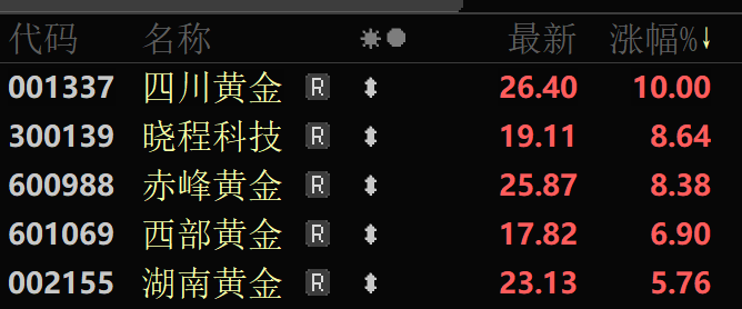 AH黄金股早间再度联袂大涨,A股黄金板块指数大幅高开高走,放量飙升逾5%,创近9个月来新高,距历史最高点仅一步之遥。板块内所有个股上涨,四川黄金连续第2日涨停,股价创近半年新高,赤峰黄金则创历史新高,西部黄金、山金国际等亦大涨创出阶段性新高。