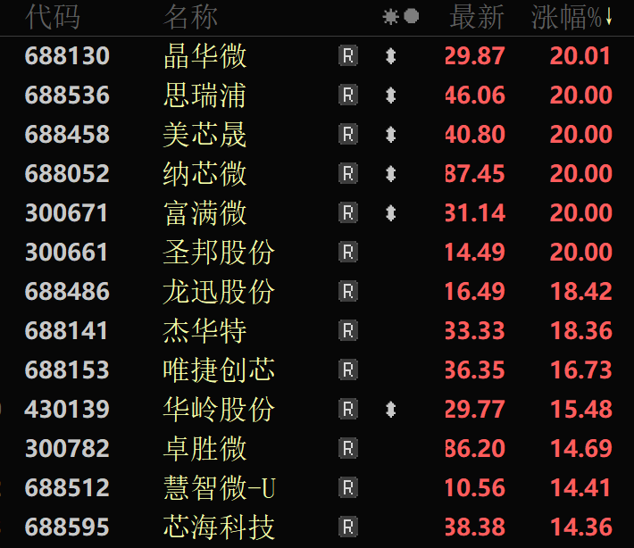MCU芯片、先进封装、光刻机、存储芯片等细分板块也均涨幅居前,芯原股份、大港股份、好上好、江化微等批量涨停。