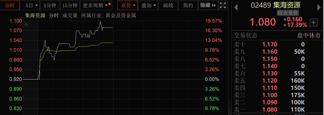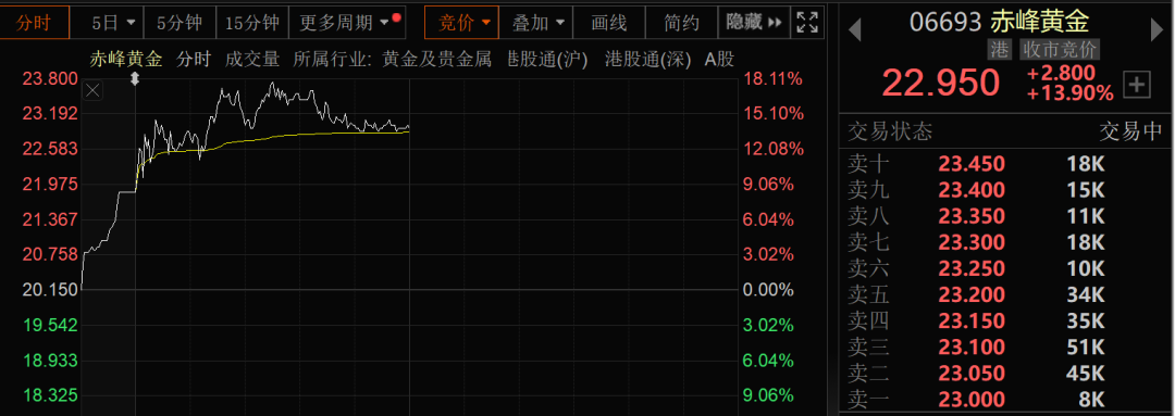 港股市场,赤峰黄金盘中再度飙涨逾18%,同样创历史新高;集海资源涨逾17%,亦创历史新高;潼关黄金则涨超12%,创3年半多来新高。中国白银集团、招金矿业等也纷纷大涨。