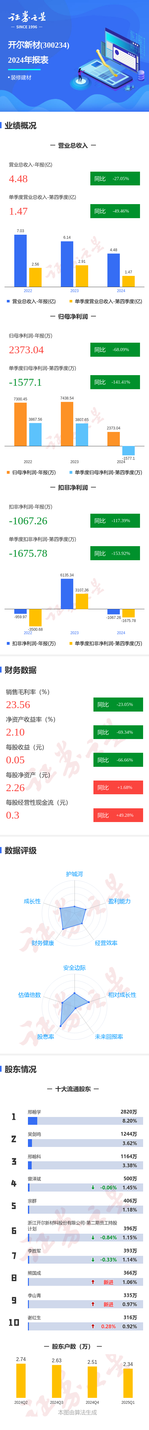 证券之星消息,开尔新材2024年年报显示,公司主营收入4.49亿元,同比下降27.05%;归母净利润2373.04万元,同比下降68.1%;扣非净利润-1067.27万元,同比下降117.4%;其中2024年第四季度,公司单季度主营收入1.47亿元,同比下降49.47%;单季度归母净利润-1577.11万元,同比下降141.42%;单季度扣非净利润-1675.78万元,同比下降153.93%;负债率15.45%,投资收益2555.37万元,财务费用-371.87万元,毛利率23.56%。