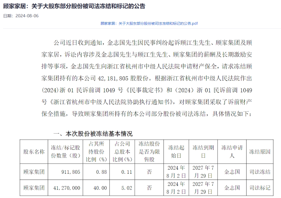 彼时,顾家家居(603816.SH)发布公告称,公司收到通知,前副董事长金志国因民事纠纷起诉顾家家居董事长顾江生、顾家集团及顾家家居,请求冻结顾家集团持有的上市公司4218.18万股股份,占总股本的5.13%。公告显示,诉讼内容涉及金志国与顾江生、顾家集团的薪酬及长期激励安排等事项。