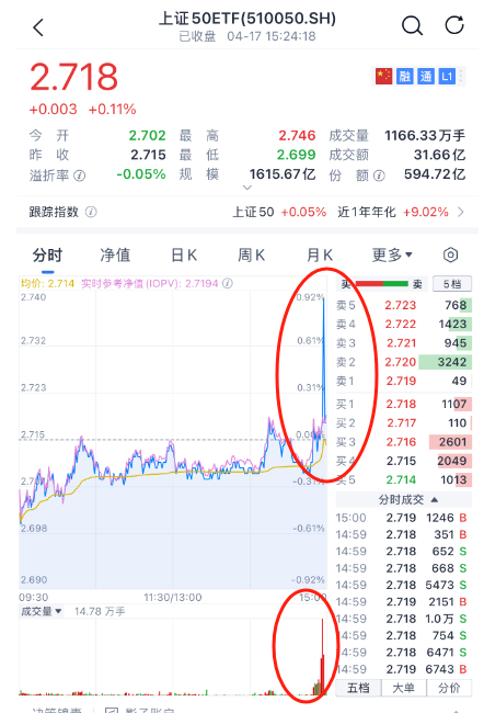 值得注意的是,尾盘神秘资金疑似再度出手,上证50ETF尾盘一度强势拉升涨近1%,但随后涨幅回落。