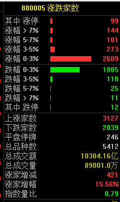 市场共3127只个股上涨,99只个股涨停,2039只个股下跌。