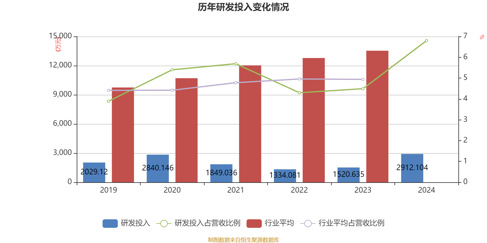 2024年全年,公司研发投入金额为2912.1万元,同比增长91.51%;研发投入占营业收入比例为6.8%,相比上年同期上升2.31个百分点。此外,公司全年研发投入资本化率为0%。