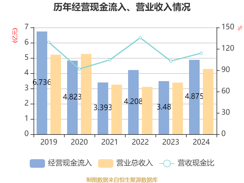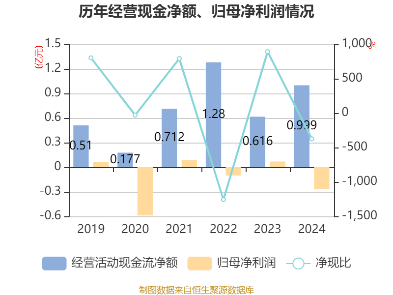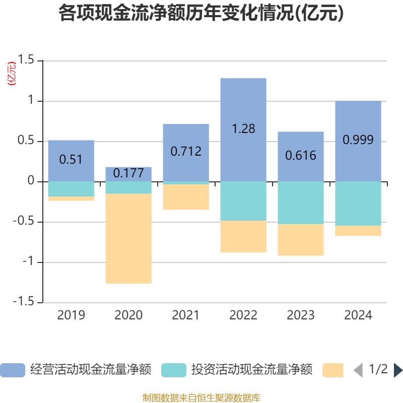 截至2024年,公司经营活动现金流净额为9994.53万元,同比增长62.32%;筹资活动现金流净额-1237.55万元,同比增加2653.18万元;投资活动现金流净额-5519.33万元,上年同期为-5327.82万元。