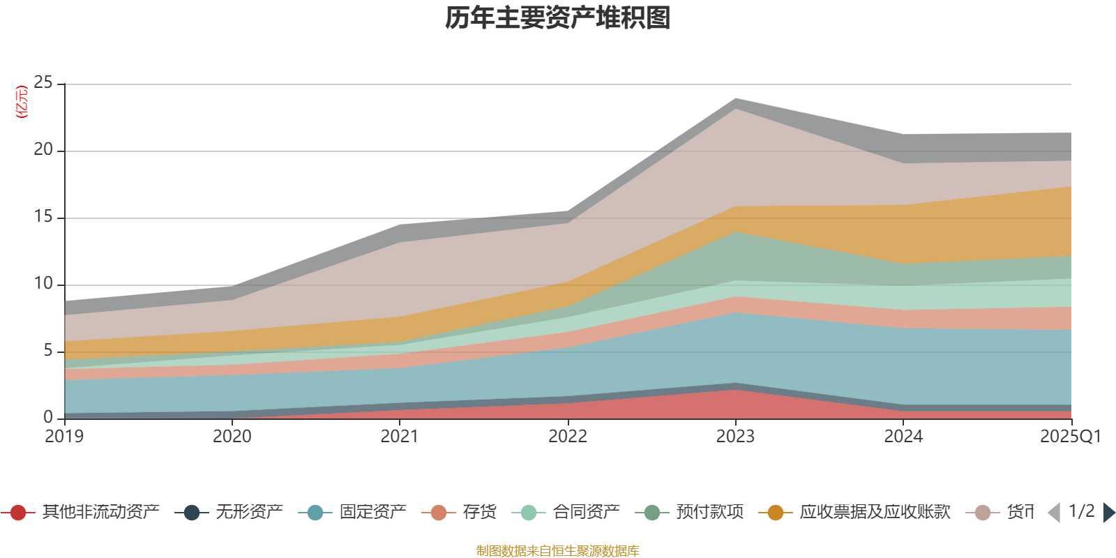 资产重大变化方面,截至2025年一季度末,公司货币资金较上年末减少38.51%,占公司总资产比重下降5.7个百分点;应收票据及应收账款较上年末增加18.44%,占公司总资产比重上升3.69个百分点;存货较上年末增加25.98%,占公司总资产比重上升1.64个百分点;合同资产较上年末增加15.99%,占公司总资产比重上升1.31个百分点。