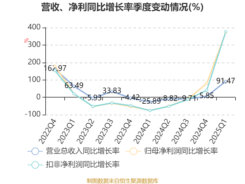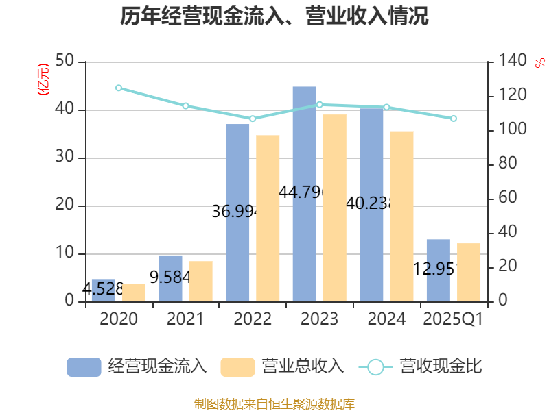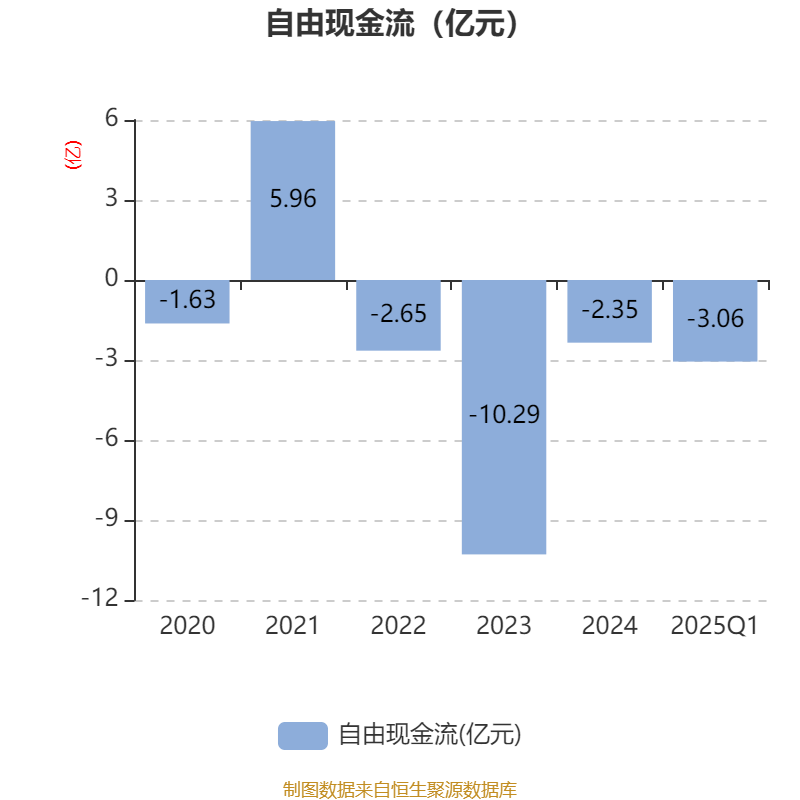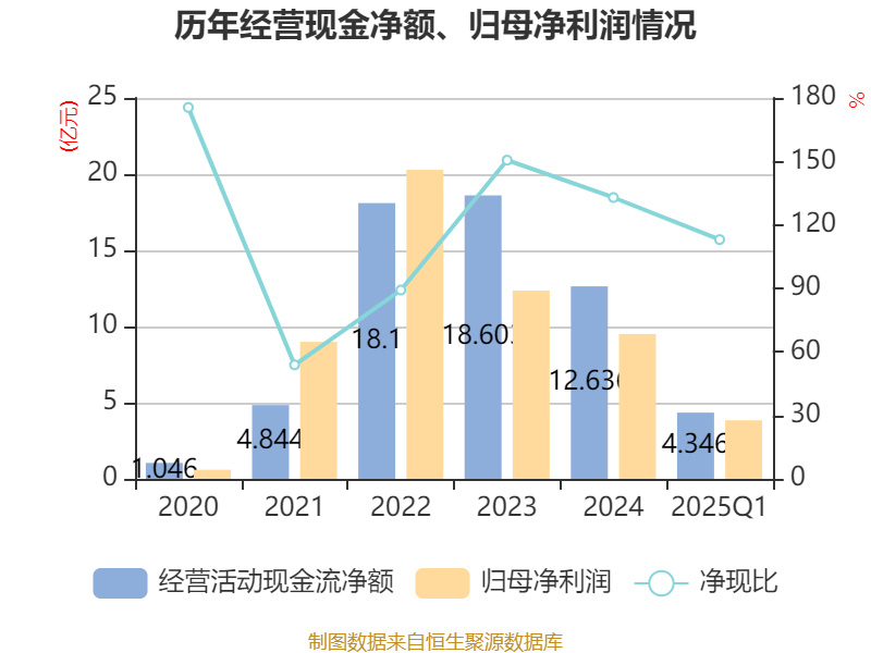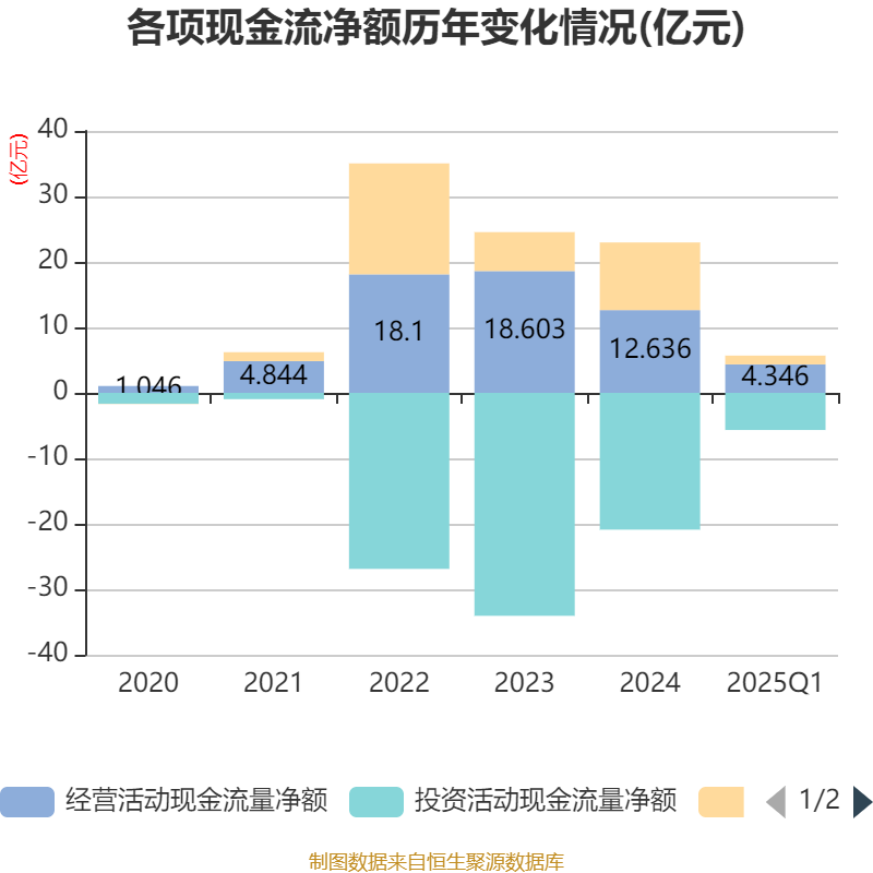 截至2025年一季度末,公司经营活动现金流净额为4.35亿元,同比增加5.13亿元;筹资活动现金流净额1.34亿元,同比减少5.81亿元;投资活动现金流净额-5.68亿元,上年同期为-8.23亿元。