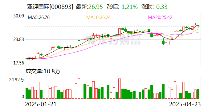 中证智能财讯亚钾国际(000893)4月24日披露2025年第一季度报告。公司实现营业总收入12.13亿元,同比增长91.47%;归母净利润3.84亿元,同比增长373.53%;扣非净利润3.84亿元,同比增长376.02%;经营活动产生的现金流量净额为4.35亿元,上年同期为-7885.58万元;报告期内,亚钾国际基本每股收益为0.4208元,加权平均净资产收益率为3.16%。