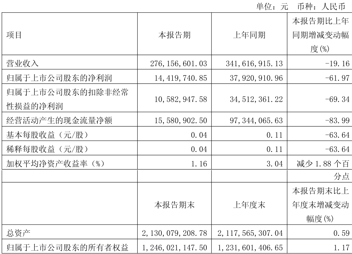 中证智能财讯华培动力(603121)4月25日披露2025年第一季度报告。公司实现营业总收入2.76亿元,同比下降19.16%;归母净利润1441.97万元,同比下降61.97%;扣非净利润1058.29万元,同比下降69.34%;经营活动产生的现金流量净额为1558.09万元,同比下降83.99%;报告期内,华培动力基本每股收益为0.04元,加权平均净资产收益率为1.16%。