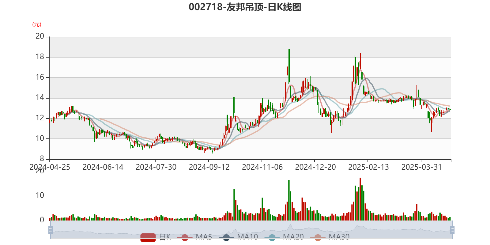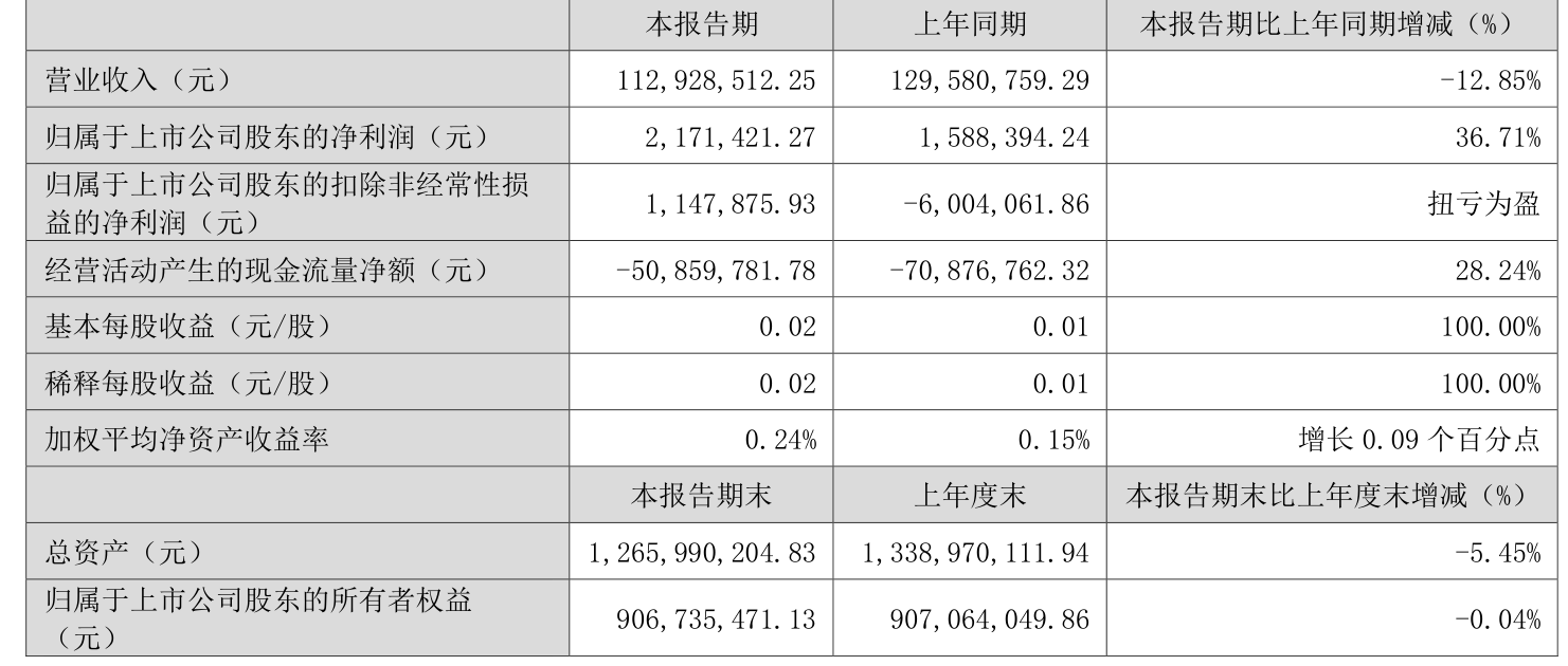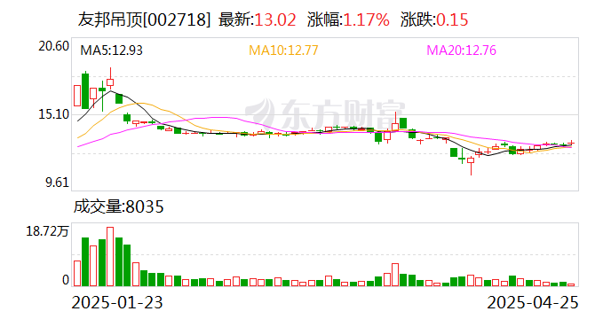 中证智能财讯友邦吊顶(维权)(002718)4月25日披露2025年第一季度报告。公司实现营业总收入1.13亿元,同比下降12.85%;归母净利润217.14万元,同比增长36.71%;扣非净利润114.79万元,同比扭亏;经营活动产生的现金流量净额为-5085.98万元,上年同期为-7087.68万元;报告期内,友邦吊顶基本每股收益为0.02元,加权平均净资产收益率为0.24%。