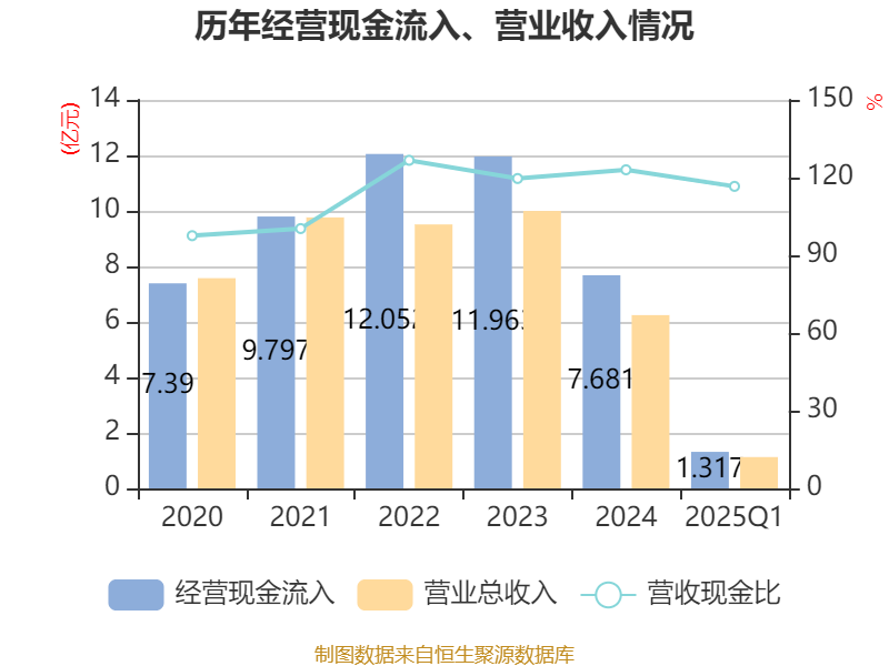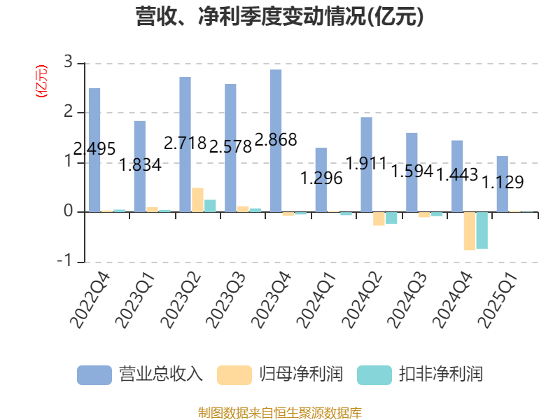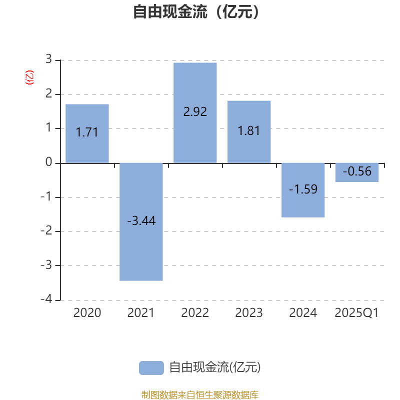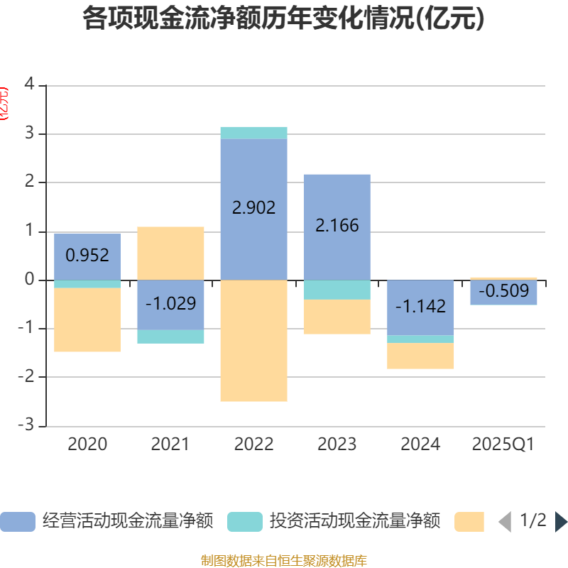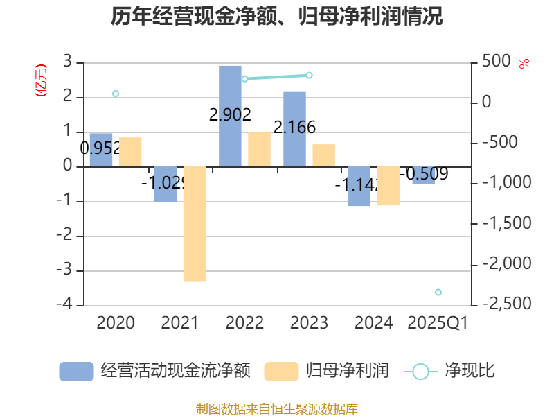 截至2025年一季度末,公司经营活动现金流净额为-5085.98万元,同比增加2001.7万元;筹资活动现金流净额500.11万元,同比增加2029.84万元;投资活动现金流净额-84.43万元,上年同期为-2339.29万元。