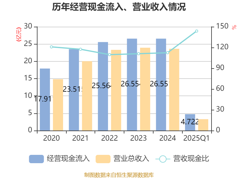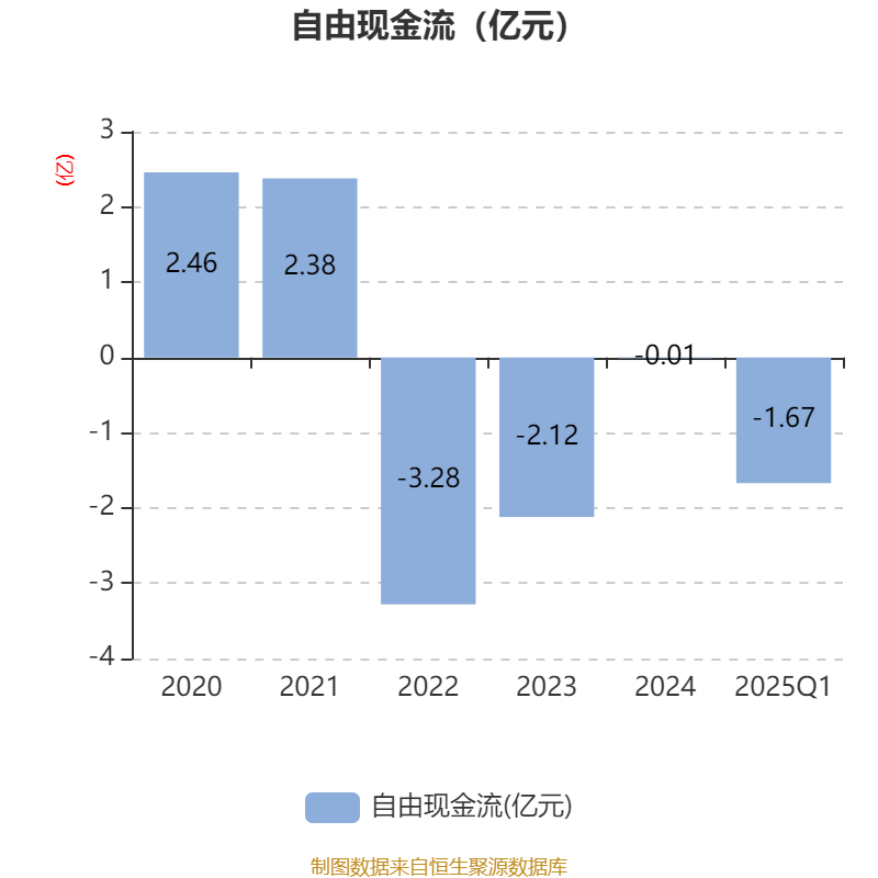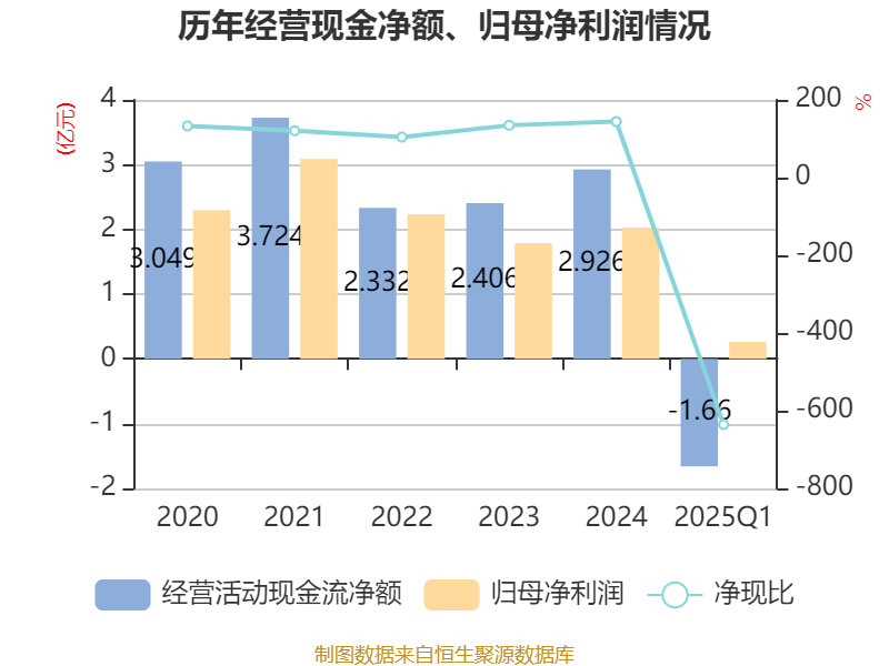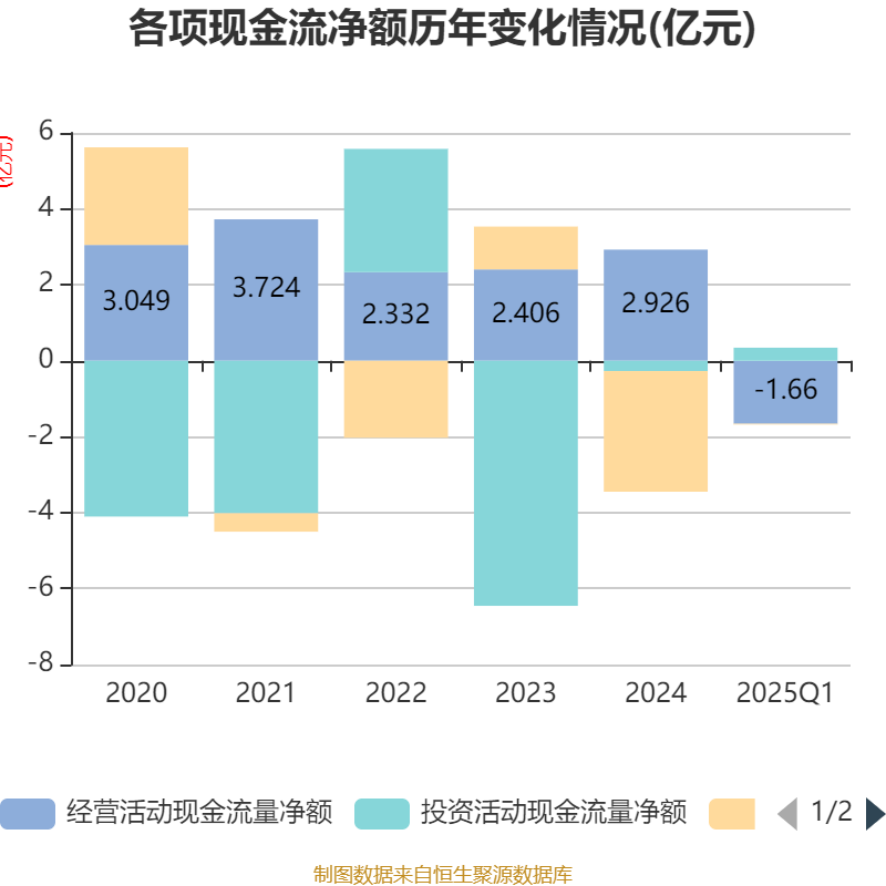 截至2025年一季度末,公司经营活动现金流净额为-1.66亿元,同比减少1094.64万元;筹资活动现金流净额-186.27万元,同比增加6857.37万元;投资活动现金流净额3432.68万元,上年同期为2.66亿元。