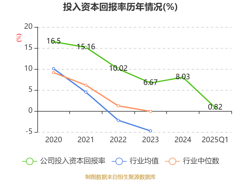 盈利能力方面, 2025年一季度公司加权平均净资产收益率为1.2%,同比下降0.14个百分点。公司2025年第一季度投入资本回报率为0.82%,较上年同期下降0.12个百分点。