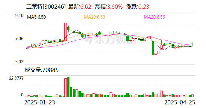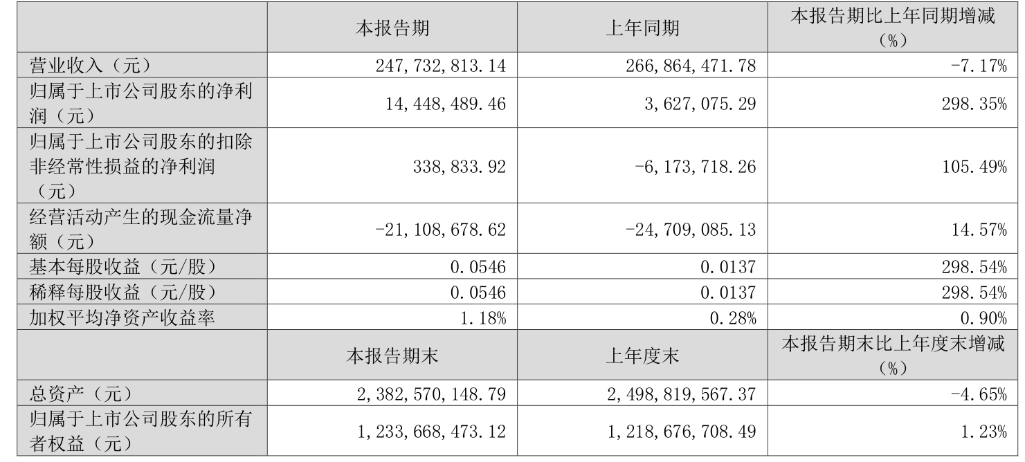 中证智能财讯宝莱特(300246)4月25日披露2025年第一季度报告。公司实现营业总收入2.48亿元,同比下降7.17%;归母净利润1444.85万元,同比增长298.35%;扣非净利润33.88万元,同比扭亏;经营活动产生的现金流量净额为-2110.87万元,上年同期为-2470.91万元;报告期内,宝莱特基本每股收益为0.0546元,加权平均净资产收益率为1.18%。
