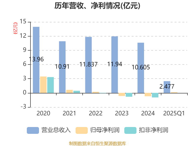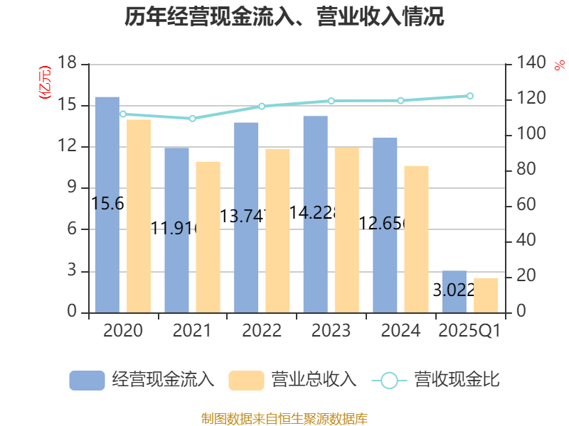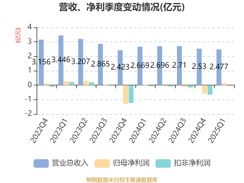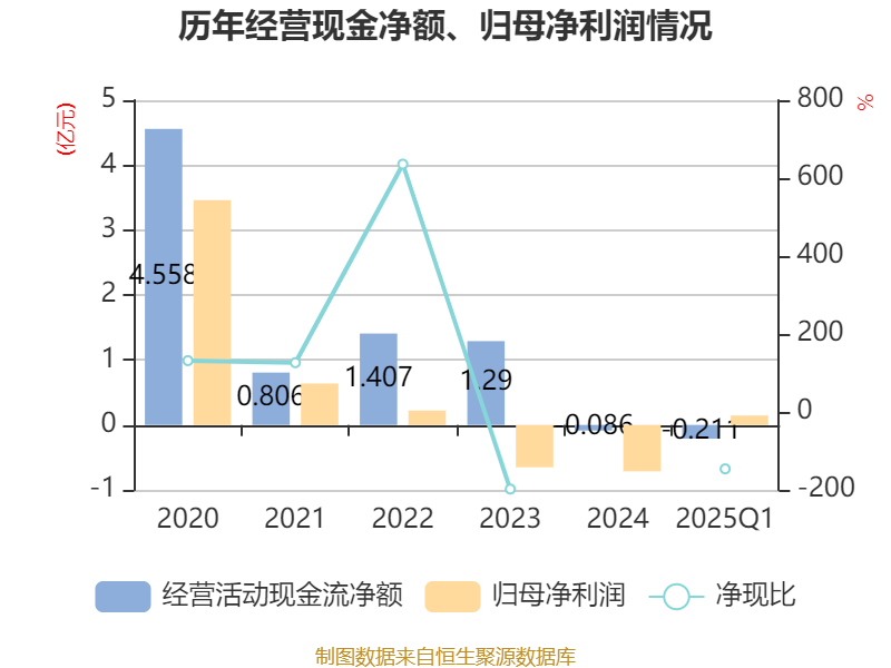 截至2025年一季度末,公司经营活动现金流净额为-2110.87万元,同比增加360.04万元;筹资活动现金流净额-5199.16万元,同比减少1.57亿元;投资活动现金流净额2.2亿元,上年同期为673.99万元。