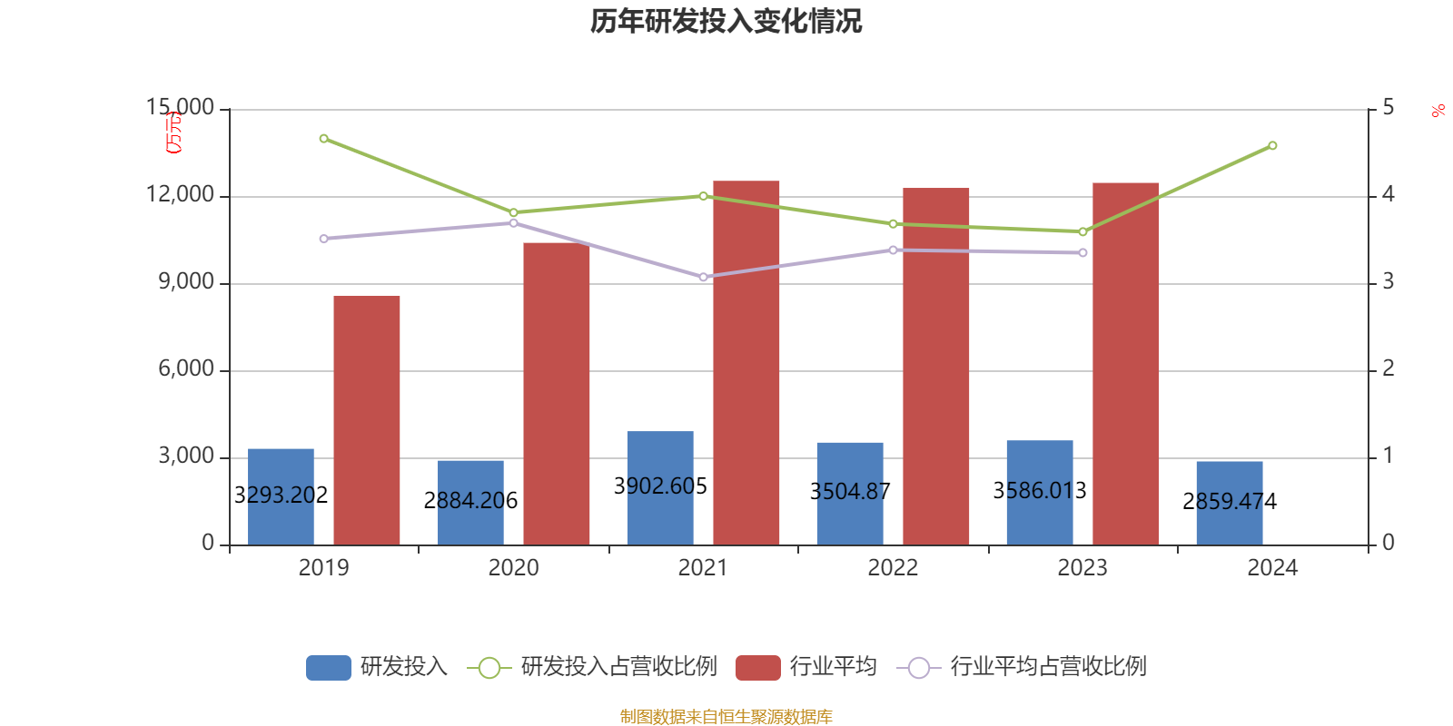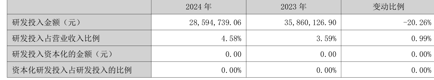 2024年全年,公司研发投入金额为2859.47万元,同比下降20.26%;研发投入占营业收入比例为4.58%,相比上年同期上升0.99个百分点。此外,公司全年研发投入资本化率为0%。
