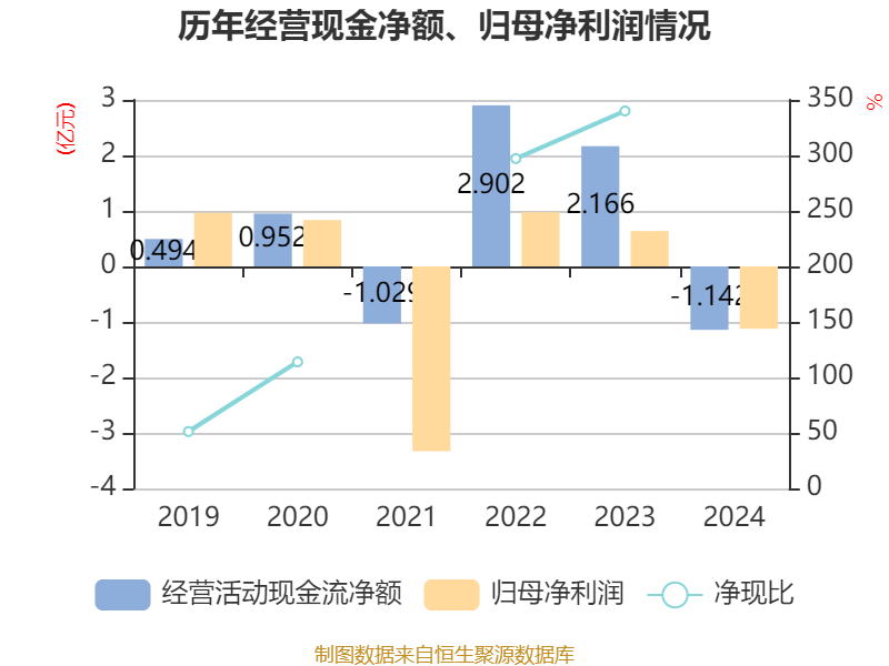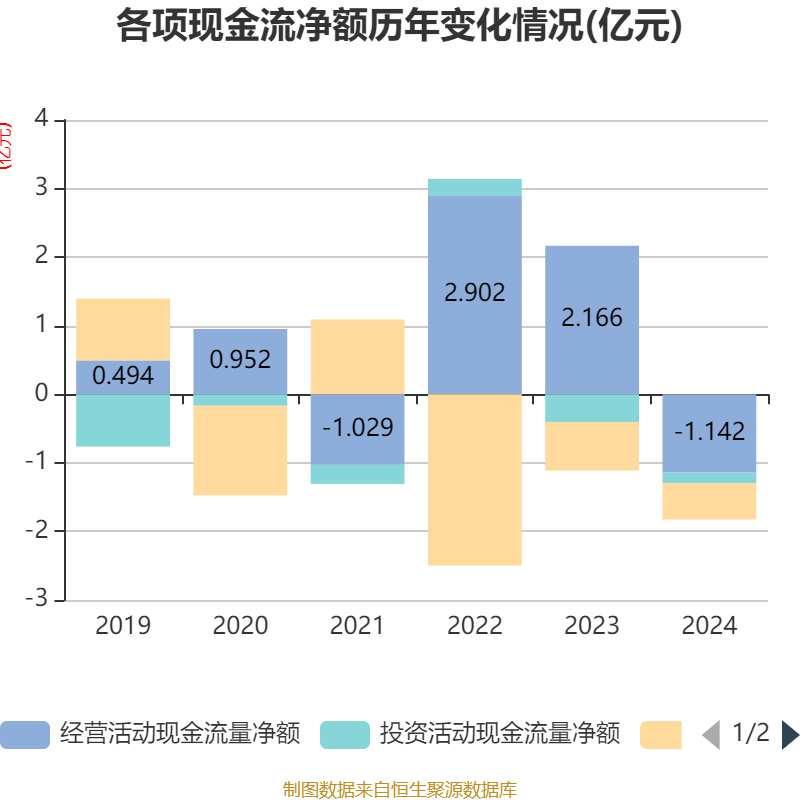 截至2024年,公司经营活动现金流净额为-1.14亿元,同比减少3.31亿元;筹资活动现金流净额-5311.06万元,同比增加1792.55万元;投资活动现金流净额-1538.12万元,上年同期为-4033.35万元。