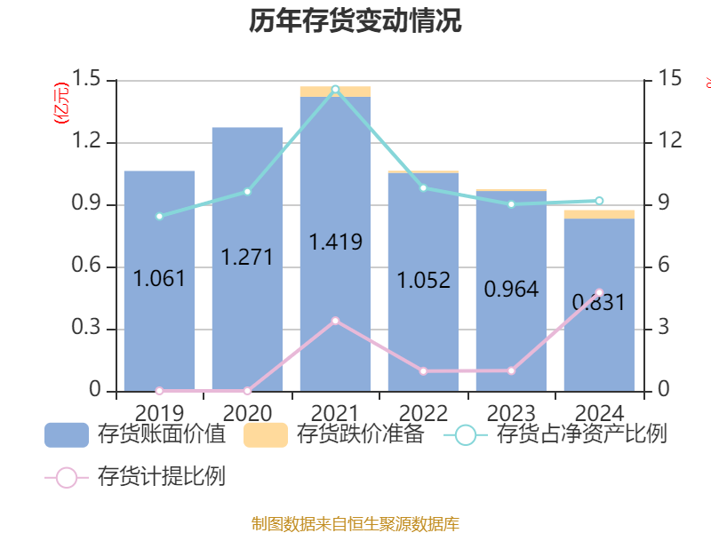 从存货变动来看,截至2024年末,公司存货账面价值为8314.07万元,占净资产的9.17%,较上年末减少1321.41万元。其中,存货跌价准备为413.71万元,计提比例为4.74%。