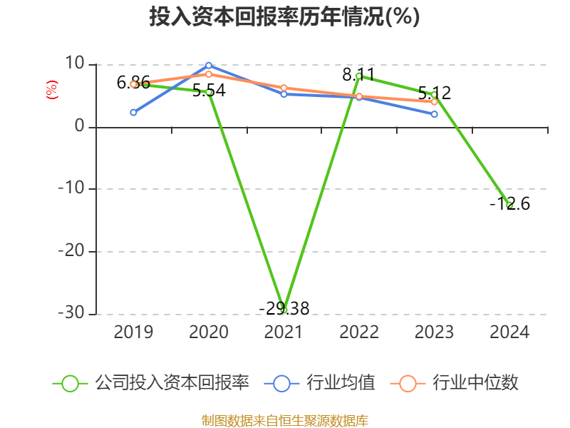 数据显示,2024年公司加权平均净资产收益率为-11.43%,较上年同期下降17.4个百分点。公司2024年投入资本回报率为-12.6%,较上年同期下降17.72个百分点。