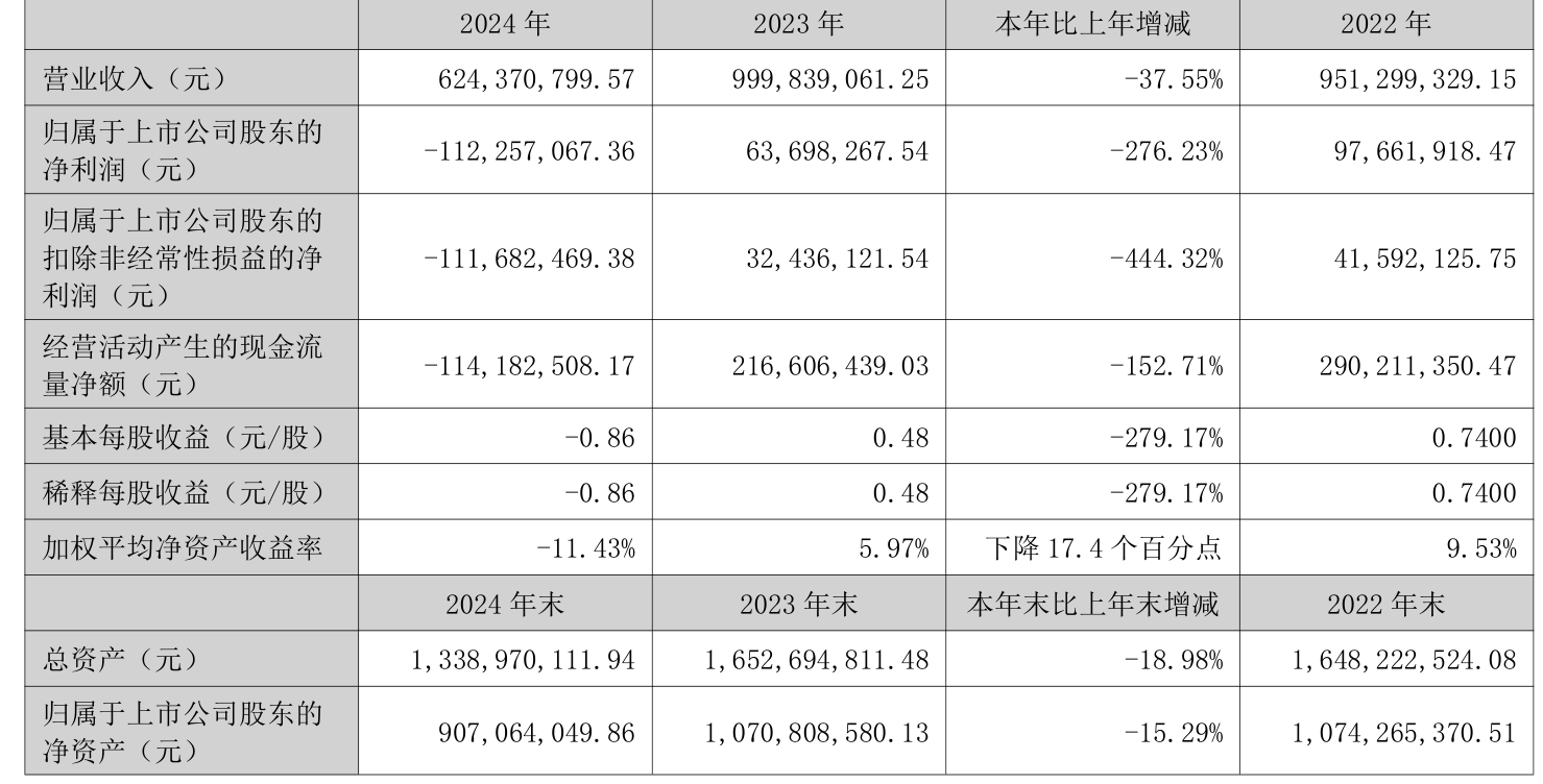 中证智能财讯友邦吊顶(维权)(002718)4月25日披露2024年年度报告。2024年,公司实现营业总收入6.24亿元,同比下降37.55%;归母净利润亏损1.12亿元,上年同期盈利6369.83万元;扣非净利润亏损1.12亿元,上年同期盈利3243.61万元;经营活动产生的现金流量净额为-1.14亿元,上年同期为2.17亿元;报告期内,友邦吊顶基本每股收益为-0.86元,加权平均净资产收益率为-11.43%。
