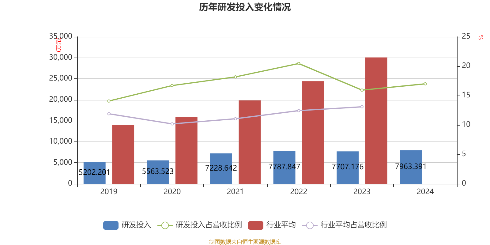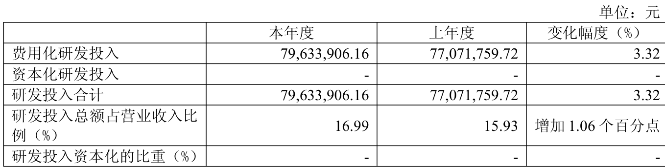 2024年全年,公司研发投入金额为7963.39万元,同比增长3.32%;研发投入占营业收入比例为16.99%,相比上年同期上升1.06个百分点。