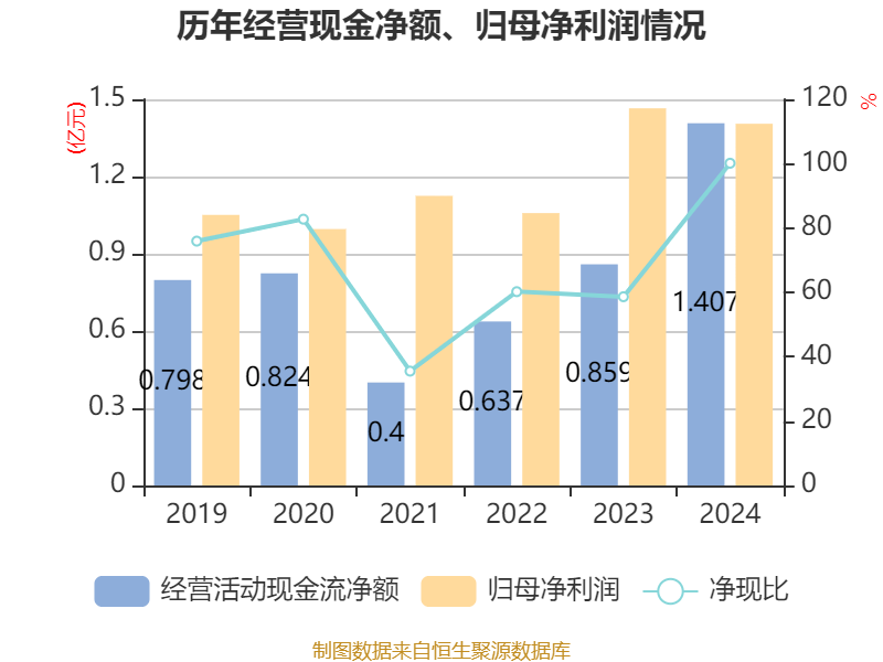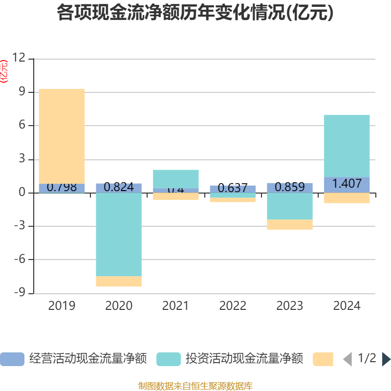 截至2024年,公司经营活动现金流净额为1.41亿元,同比增长63.76%;筹资活动现金流净额-9380.23万元,同比减少426.9万元;投资活动现金流净额5.56亿元,上年同期为-2.41亿元。