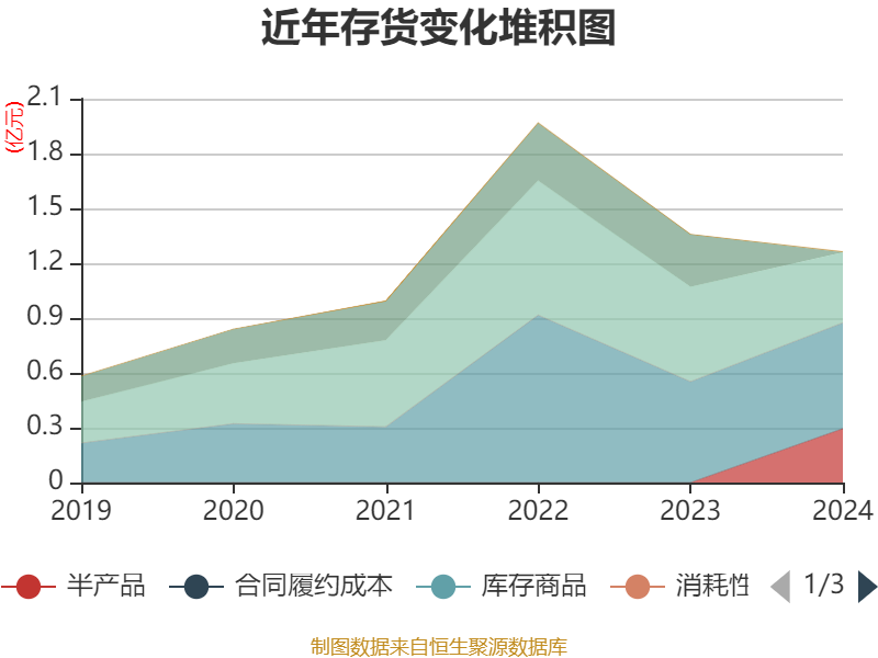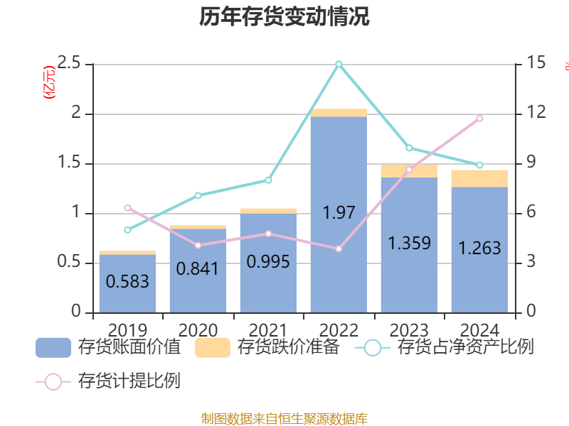 从存货变动来看,截至2024年末,公司存货账面价值为1.26亿元,占净资产的8.89%,较上年末减少959.97万元。其中,存货跌价准备为1676.16万元,计提比例为11.71%。