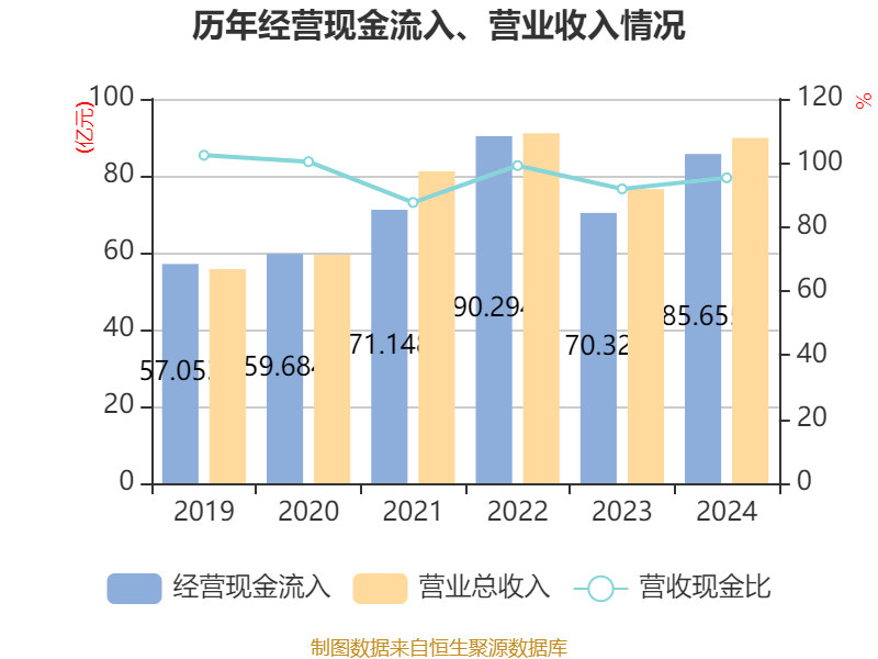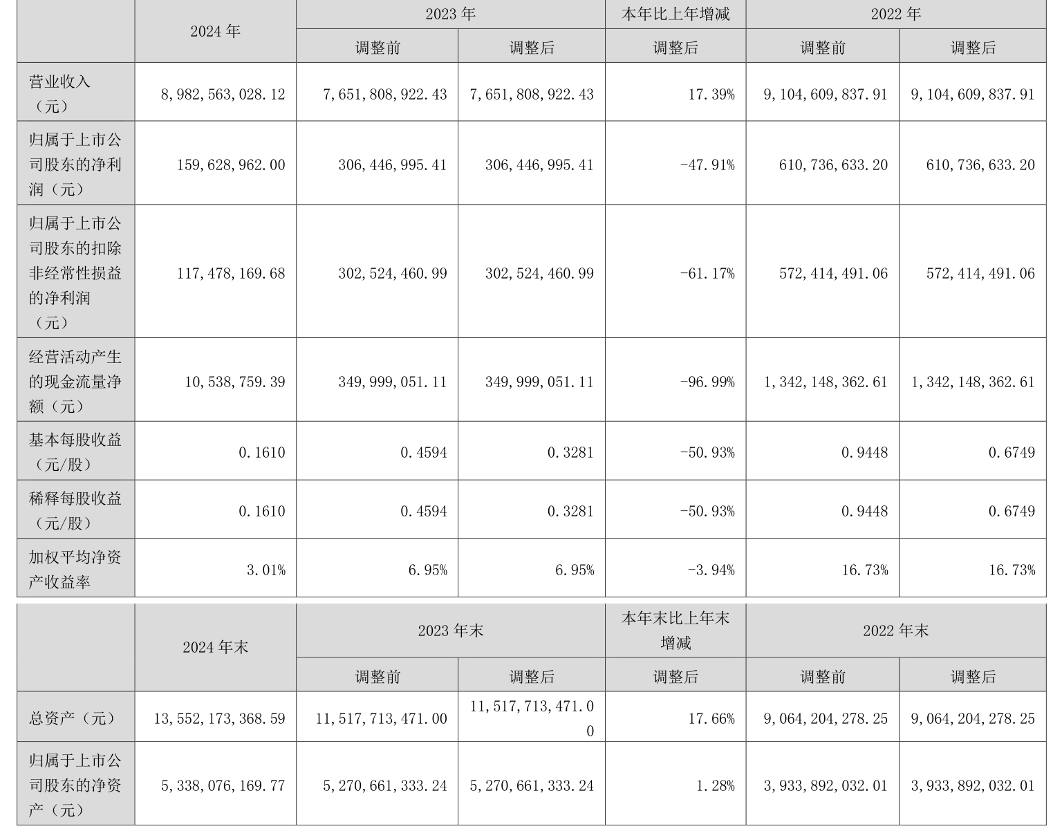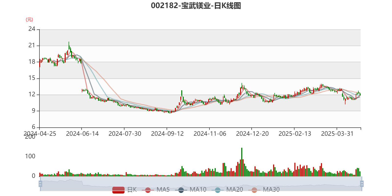 中证智能财讯宝武镁业(002182)4月25日披露2024年年度报告。2024年,公司实现营业总收入89.83亿元,同比增长17.39%;归母净利润1.60亿元,同比下降47.91%;扣非净利润1.17亿元,同比下降61.17%;经营活动产生的现金流量净额为1053.88万元,同比下降96.99%;报告期内,宝武镁业基本每股收益为0.161元,加权平均净资产收益率为3.01%。公司2024年度分配预案为:拟向全体股东每10股派现0.5元(含税)。
