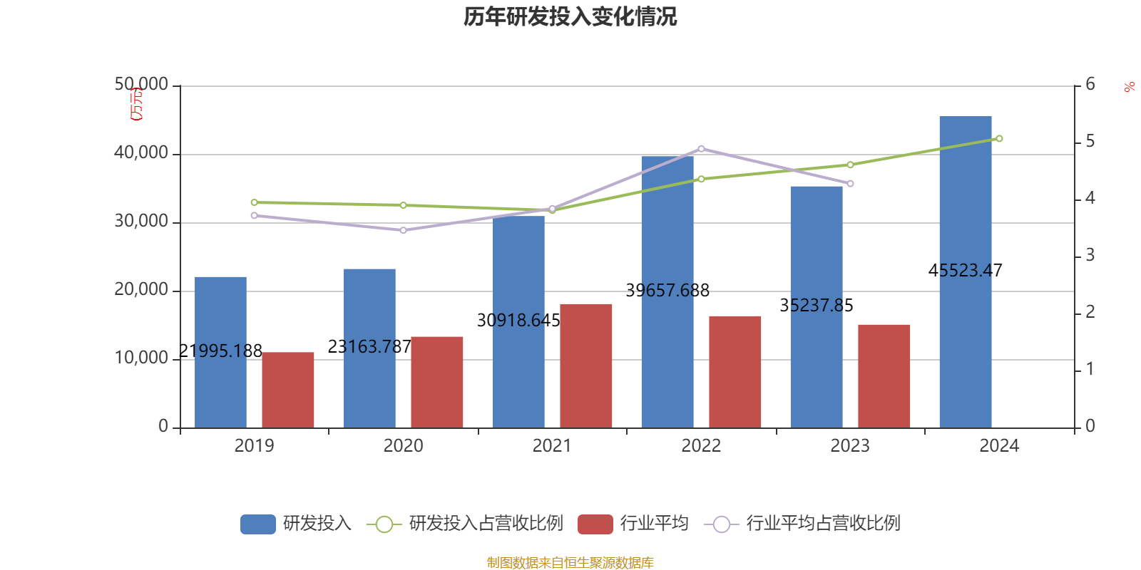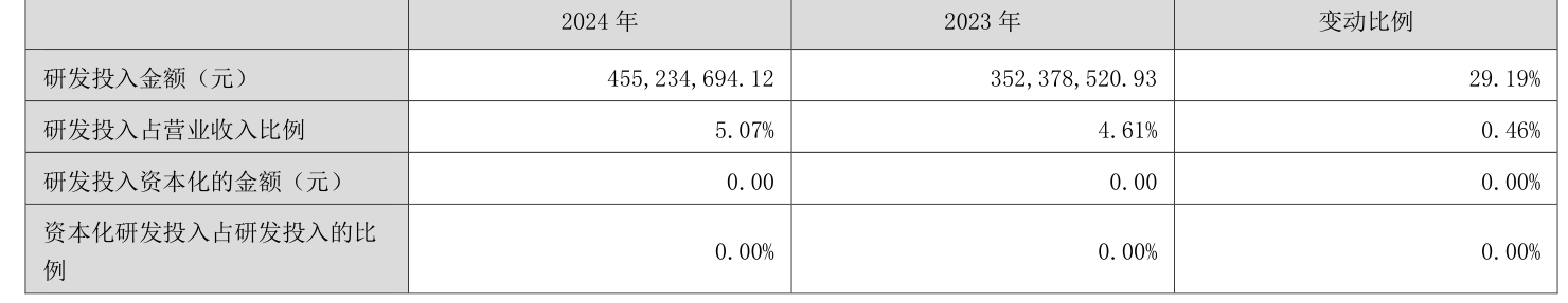 2024年全年,公司研发投入金额为4.55亿元,同比增长29.19%;研发投入占营业收入比例为5.07%,相比上年同期上升0.46个百分点。此外,公司全年研发投入资本化率为0%。
