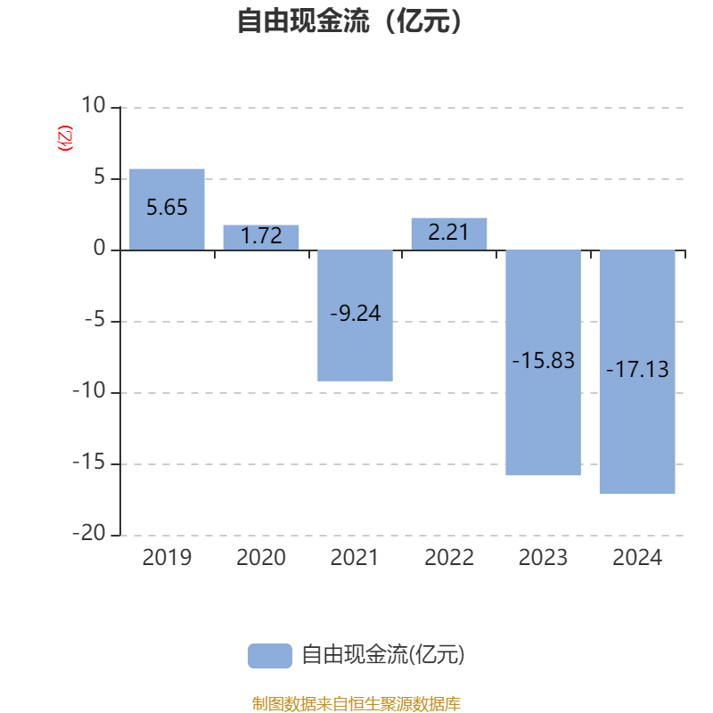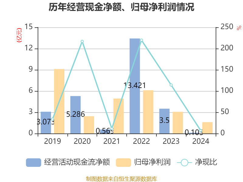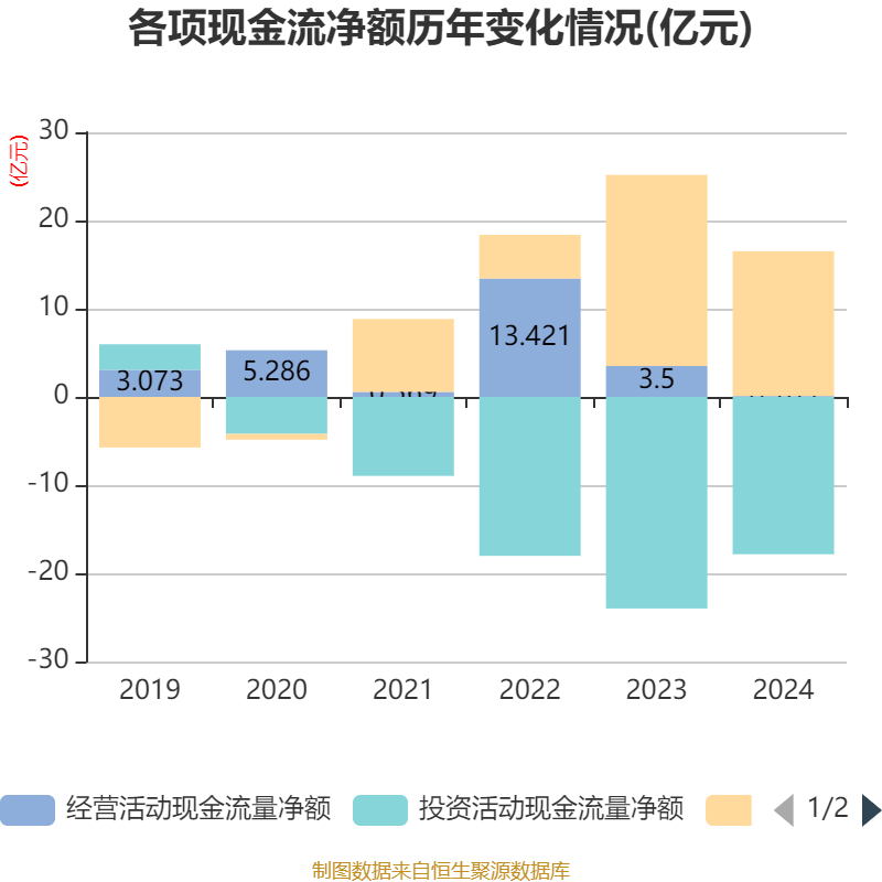 截至2024年,公司经营活动现金流净额为1053.88万元,同比下降96.99%;筹资活动现金流净额16.42亿元,同比减少5.25亿元;投资活动现金流净额-17.84亿元,上年同期为-23.99亿元。