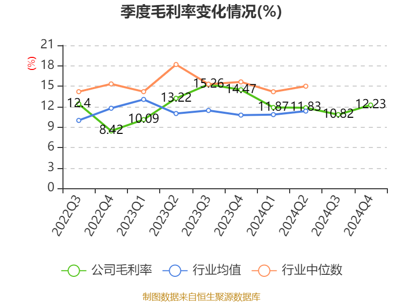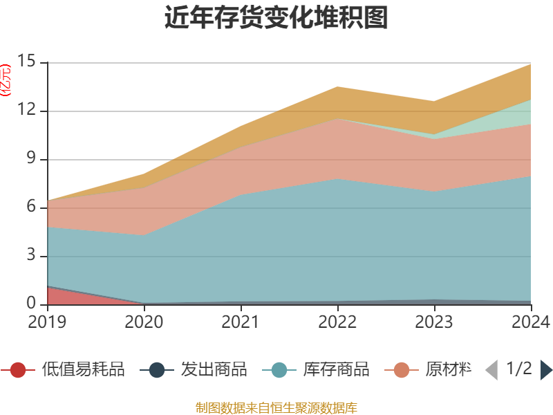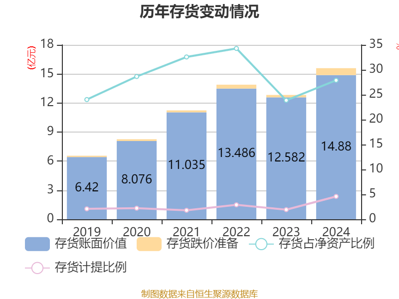 从存货变动来看,截至2024年末,公司存货账面价值为14.88亿元,占净资产的27.88%,较上年末增加2.3亿元。其中,存货跌价准备为7144.73万元,计提比例为4.58%。