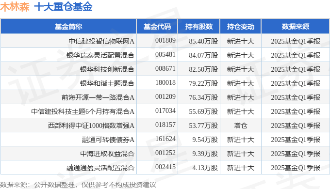持有木林森最多的基金为中信建投智信物联网A,目前规模为1.54亿元,最新净值1.0941(4月25日),较上一交易日上涨0.05%,近一年下跌5.6%。该基金现任基金经理为周紫光。