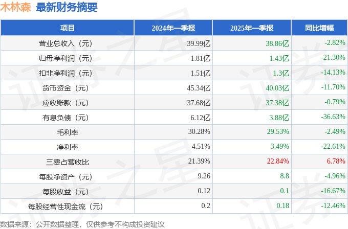 据证券之星公开数据整理,近期木林森(002745)发布2025年一季报。截至本报告期末,公司营业总收入38.86亿元,同比下降2.82%,归母净利润1.43亿元,同比下降21.3%。按单季度数据看,第一季度营业总收入38.86亿元,同比下降2.82%,第一季度归母净利润1.43亿元,同比下降21.3%。本报告期木林森公司应收账款体量较大,当期应收账款占最新年报归母净利润比达1000.05%。