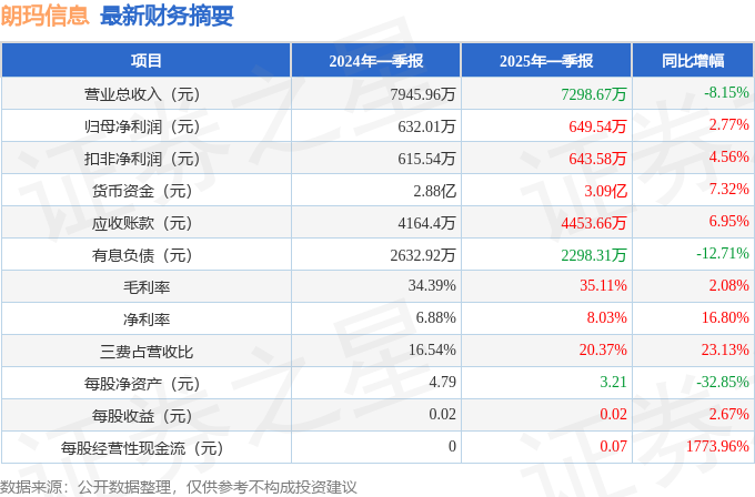 据证券之星公开数据整理,近期朗玛信息(300288)发布2025年一季报。截至本报告期末,公司营业总收入7298.67万元,同比下降8.15%,归母净利润649.54万元,同比上升2.77%。按单季度数据看,第一季度营业总收入7298.67万元,同比下降8.15%,第一季度归母净利润649.54万元,同比上升2.77%。本报告期朗玛信息盈利能力上升,毛利率同比增幅2.08%,净利率同比增幅16.8%。